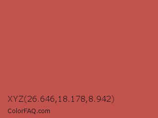 XYZ 26.646,18.178,8.942 Color is a normal red color and the nearest color is Bittersweet Shimmer #bf4f51. Hex code #c2534c and RGB value is rgb(194,83,76). In RGB color space, this color is composed of 76% red, 33% green, 30% blue, In CMYK color space, this color is composed of 0% cyan, 57% magenta, 61% yellow , 24% black , In HSL color space, this color has a hue angle of 4° , 49% saturation and 53% lightness.