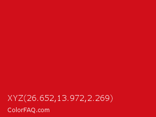 XYZ 26.652,13.972,2.269 Color is a normal red color and the nearest color is Lava #cf1020. Hex code #d10f1a and RGB value is rgb(209,15,26). In RGB color space, this color is composed of 82% red, 6% green, 10% blue, In CMYK color space, this color is composed of 0% cyan, 93% magenta, 88% yellow , 18% black , In HSL color space, this color has a hue angle of 357° , 87% saturation and 44% lightness.
