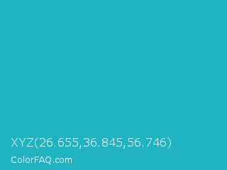 XYZ 26.655,36.845,56.746 Color is a normal cyan color and the nearest color is Pacific Blue #1ca9c9. Hex code #20b4c2 and RGB value is rgb(32,180,194). In RGB color space, this color is composed of 13% red, 71% green, 76% blue, In CMYK color space, this color is composed of 84% cyan, 7% magenta, 0% yellow , 24% black , In HSL color space, this color has a hue angle of 185° , 72% saturation and 44% lightness.