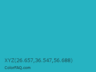 XYZ 26.657,36.547,56.688 Color is a normal cyan color and the nearest color is Ball Blue #21abcd. Hex code #26b3c2 and RGB value is rgb(38,179,194). In RGB color space, this color is composed of 15% red, 70% green, 76% blue, In CMYK color space, this color is composed of 80% cyan, 8% magenta, 0% yellow , 24% black , In HSL color space, this color has a hue angle of 186° , 67% saturation and 45% lightness.