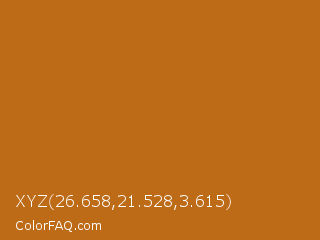XYZ 26.658,21.528,3.615 Color is a normal orange color and the nearest color is Bourbon #ba6f1e. Hex code #be6b18 and RGB value is rgb(190,107,24). In RGB color space, this color is composed of 75% red, 42% green, 9% blue, In CMYK color space, this color is composed of 0% cyan, 44% magenta, 87% yellow , 25% black , In HSL color space, this color has a hue angle of 30° , 78% saturation and 42% lightness.