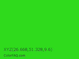 XYZ 26.668,51.328,9.6 Color is a normal green color and the nearest color is Lime Green #32cd32. Hex code #2edb1c and RGB value is rgb(46,219,28). In RGB color space, this color is composed of 18% red, 86% green, 11% blue, In CMYK color space, this color is composed of 79% cyan, 0% magenta, 87% yellow , 14% black , In HSL color space, this color has a hue angle of 114° , 77% saturation and 48% lightness.
