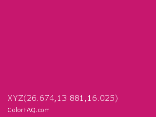 XYZ 26.674,13.881,16.025 Color is a normal rose color and the nearest color is Magenta Dye #ca1f7b. Hex code #c7176e and RGB value is rgb(199,23,110). In RGB color space, this color is composed of 78% red, 9% green, 43% blue, In CMYK color space, this color is composed of 0% cyan, 88% magenta, 45% yellow , 22% black , In HSL color space, this color has a hue angle of 330° , 79% saturation and 44% lightness.