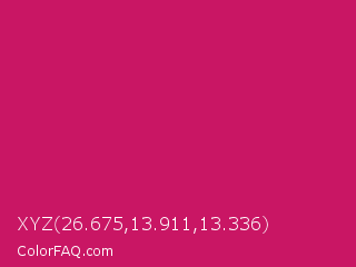 XYZ 26.675,13.911,13.336 Color is a normal rose color and the nearest color is Dogwood Rose #d71868. Hex code #c91664 and RGB value is rgb(201,22,100). In RGB color space, this color is composed of 79% red, 9% green, 39% blue, In CMYK color space, this color is composed of 0% cyan, 89% magenta, 50% yellow , 21% black , In HSL color space, this color has a hue angle of 334° , 80% saturation and 44% lightness.