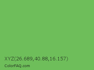 XYZ 26.689,40.88,16.157 Color is a normal green color and the nearest color is Mantis #74c365. Hex code #6ebe5a and RGB value is rgb(110,190,90). In RGB color space, this color is composed of 43% red, 75% green, 35% blue, In CMYK color space, this color is composed of 42% cyan, 0% magenta, 53% yellow , 25% black , In HSL color space, this color has a hue angle of 108° , 43% saturation and 55% lightness.