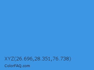 XYZ 26.696,28.351,76.738 Color is a normal blue color and the nearest color is Tufts Blue #3e8ede. Hex code #3d96e3 and RGB value is rgb(61,150,227). In RGB color space, this color is composed of 24% red, 59% green, 89% blue, In CMYK color space, this color is composed of 73% cyan, 34% magenta, 0% yellow , 11% black , In HSL color space, this color has a hue angle of 208° , 75% saturation and 56% lightness.