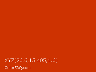 XYZ 26.6,15.405,1.6 Color is a normal red color and the nearest color is Sinopia #cb410b. Hex code #ce3201 and RGB value is rgb(206,50,1). In RGB color space, this color is composed of 81% red, 20% green, 0% blue, In CMYK color space, this color is composed of 0% cyan, 76% magenta, 100% yellow , 19% black , In HSL color space, this color has a hue angle of 14° , 99% saturation and 41% lightness.