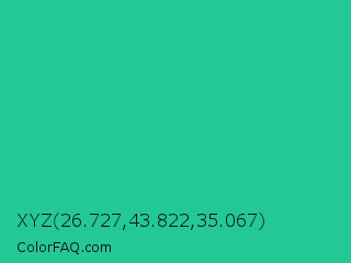 XYZ 26.727,43.822,35.067 Color is a normal green color and the nearest color is Shamrock #33cc99. Hex code #24c894 and RGB value is rgb(36,200,148). In RGB color space, this color is composed of 14% red, 78% green, 58% blue, In CMYK color space, this color is composed of 82% cyan, 0% magenta, 26% yellow , 22% black , In HSL color space, this color has a hue angle of 161° , 69% saturation and 46% lightness.