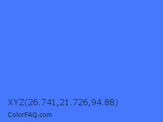 XYZ 26.741,21.726,94.88 Color is a light blue color and the nearest color is Blueberry #4f86f7. Hex code #4578fc and RGB value is rgb(69,120,252). In RGB color space, this color is composed of 27% red, 47% green, 99% blue, In CMYK color space, this color is composed of 73% cyan, 52% magenta, 0% yellow , 1% black , In HSL color space, this color has a hue angle of 223° , 97% saturation and 63% lightness.