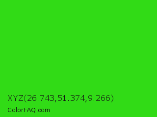 XYZ 26.743,51.374,9.266 Color is a normal green color and the nearest color is Harlequin Green #46cb18. Hex code #31db16 and RGB value is rgb(49,219,22). In RGB color space, this color is composed of 19% red, 86% green, 9% blue, In CMYK color space, this color is composed of 78% cyan, 0% magenta, 90% yellow , 14% black , In HSL color space, this color has a hue angle of 112° , 82% saturation and 47% lightness.