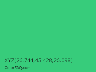 XYZ 26.744,45.428,26.098 Color is a normal green color and the nearest color is UFO Green #3cd070. Hex code #37cc7b and RGB value is rgb(55,204,123). In RGB color space, this color is composed of 22% red, 80% green, 48% blue, In CMYK color space, this color is composed of 73% cyan, 0% magenta, 40% yellow , 20% black , In HSL color space, this color has a hue angle of 147° , 59% saturation and 51% lightness.