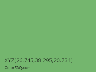 XYZ 26.745,38.295,20.734 Color is a normal green color and the nearest color is Iguana Green #71bc78. Hex code #74b66e and RGB value is rgb(116,182,110). In RGB color space, this color is composed of 45% red, 71% green, 43% blue, In CMYK color space, this color is composed of 36% cyan, 0% magenta, 40% yellow , 29% black , In HSL color space, this color has a hue angle of 115° , 33% saturation and 57% lightness.