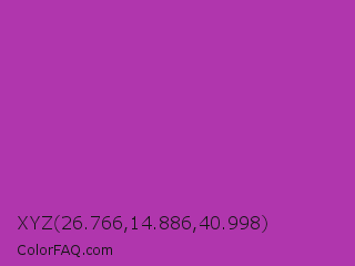 XYZ 26.766,14.886,40.998 Color is a normal magenta color and the nearest color is Byzantine #bd33a4. Hex code #b036ad and RGB value is rgb(176,54,173). In RGB color space, this color is composed of 69% red, 21% green, 68% blue, In CMYK color space, this color is composed of 0% cyan, 69% magenta, 2% yellow , 31% black , In HSL color space, this color has a hue angle of 301° , 53% saturation and 45% lightness.