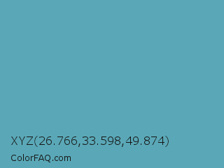 XYZ 26.766,33.598,49.874 Color is a normal cyan color and the nearest color is Fountain Blue #56b4be. Hex code #5aa8b7 and RGB value is rgb(90,168,183). In RGB color space, this color is composed of 35% red, 66% green, 72% blue, In CMYK color space, this color is composed of 51% cyan, 8% magenta, 0% yellow , 28% black , In HSL color space, this color has a hue angle of 190° , 39% saturation and 54% lightness.
