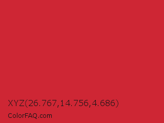 XYZ 26.767,14.756,4.686 Color is a normal red color and the nearest color is Amaranth Red #d3212d. Hex code #ce2634 and RGB value is rgb(206,38,52). In RGB color space, this color is composed of 81% red, 15% green, 20% blue, In CMYK color space, this color is composed of 0% cyan, 82% magenta, 75% yellow , 19% black , In HSL color space, this color has a hue angle of 355° , 69% saturation and 48% lightness.