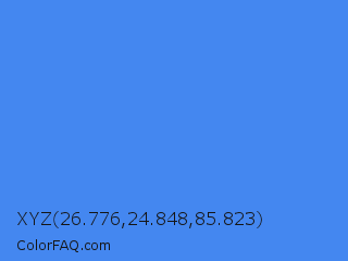XYZ 26.776,24.848,85.823 Color is a normal blue color and the nearest color is Blueberry #4f86f7. Hex code #4487f0 and RGB value is rgb(68,135,240). In RGB color space, this color is composed of 27% red, 53% green, 94% blue, In CMYK color space, this color is composed of 72% cyan, 44% magenta, 0% yellow , 6% black , In HSL color space, this color has a hue angle of 217° , 85% saturation and 60% lightness.