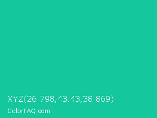 XYZ 26.798,43.43,38.869 Color is a normal cyan color and the nearest color is Caribbean Green #00cc99. Hex code #14c79d and RGB value is rgb(20,199,157). In RGB color space, this color is composed of 8% red, 78% green, 62% blue, In CMYK color space, this color is composed of 90% cyan, 0% magenta, 21% yellow , 22% black , In HSL color space, this color has a hue angle of 166° , 82% saturation and 43% lightness.