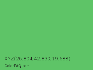 XYZ 26.804,42.839,19.688 Color is a normal green color and the nearest color is Fern #63b76c. Hex code #5ec467 and RGB value is rgb(94,196,103). In RGB color space, this color is composed of 37% red, 77% green, 40% blue, In CMYK color space, this color is composed of 52% cyan, 0% magenta, 47% yellow , 23% black , In HSL color space, this color has a hue angle of 125° , 46% saturation and 57% lightness.