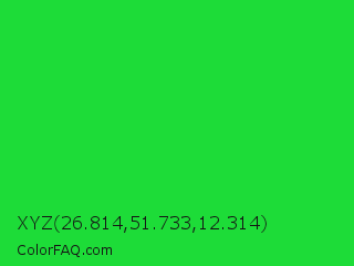 XYZ 26.814,51.733,12.314 Color is a normal green color and the nearest color is Lime Green #32cd32. Hex code #1ddc38 and RGB value is rgb(29,220,56). In RGB color space, this color is composed of 11% red, 86% green, 22% blue, In CMYK color space, this color is composed of 87% cyan, 0% magenta, 75% yellow , 14% black , In HSL color space, this color has a hue angle of 128° , 77% saturation and 49% lightness.