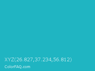 XYZ 26.827,37.234,56.812 Color is a normal cyan color and the nearest color is Java #1fc2c2. Hex code #1fb5c2 and RGB value is rgb(31,181,194). In RGB color space, this color is composed of 12% red, 71% green, 76% blue, In CMYK color space, this color is composed of 84% cyan, 7% magenta, 0% yellow , 24% black , In HSL color space, this color has a hue angle of 185° , 72% saturation and 44% lightness.