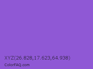 XYZ 26.828,17.623,64.938 Color is a normal violet color and the nearest color is Amethyst #9966cc. Hex code #8f58d5 and RGB value is rgb(143,88,213). In RGB color space, this color is composed of 56% red, 35% green, 84% blue, In CMYK color space, this color is composed of 33% cyan, 59% magenta, 0% yellow , 16% black , In HSL color space, this color has a hue angle of 266° , 60% saturation and 59% lightness.