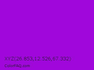 XYZ 26.853,12.526,67.332 Color is a normal purple color and the nearest color is Dark Violet #9400d3. Hex code #9e09da and RGB value is rgb(158,9,218). In RGB color space, this color is composed of 62% red, 4% green, 85% blue, In CMYK color space, this color is composed of 28% cyan, 96% magenta, 0% yellow , 15% black , In HSL color space, this color has a hue angle of 283° , 92% saturation and 45% lightness.