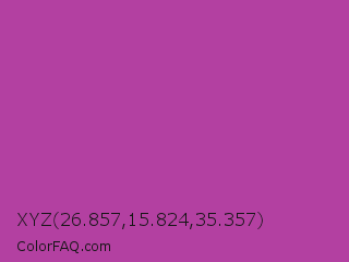 XYZ 26.857,15.824,35.357 Color is a normal magenta color and the nearest color is Byzantine #bd33a4. Hex code #b340a1 and RGB value is rgb(179,64,161). In RGB color space, this color is composed of 70% red, 25% green, 63% blue, In CMYK color space, this color is composed of 0% cyan, 64% magenta, 10% yellow , 30% black , In HSL color space, this color has a hue angle of 309° , 47% saturation and 48% lightness.
