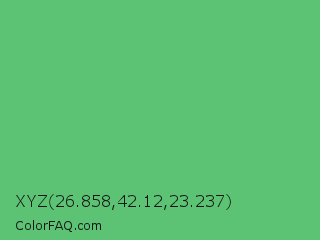 XYZ 26.858,42.12,23.237 Color is a normal green color and the nearest color is Emerald #50c878. Hex code #5cc274 and RGB value is rgb(92,194,116). In RGB color space, this color is composed of 36% red, 76% green, 45% blue, In CMYK color space, this color is composed of 53% cyan, 0% magenta, 40% yellow , 24% black , In HSL color space, this color has a hue angle of 134° , 46% saturation and 56% lightness.
