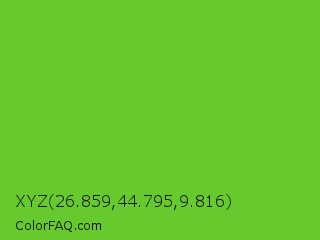 XYZ 26.859,44.795,9.816 Color is a normal green color and the nearest color is Green RYB #66b032. Hex code #66c92e and RGB value is rgb(102,201,46). In RGB color space, this color is composed of 40% red, 79% green, 18% blue, In CMYK color space, this color is composed of 49% cyan, 0% magenta, 77% yellow , 21% black , In HSL color space, this color has a hue angle of 98° , 63% saturation and 48% lightness.