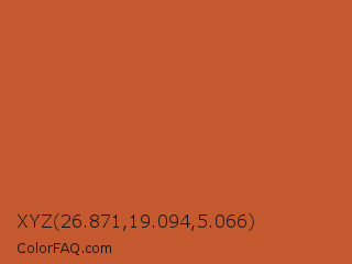 XYZ 26.871,19.094,5.066 Color is a normal orange color and the nearest color is Tuscany #bd5e2e. Hex code #c45930 and RGB value is rgb(196,89,48). In RGB color space, this color is composed of 77% red, 35% green, 19% blue, In CMYK color space, this color is composed of 0% cyan, 55% magenta, 76% yellow , 23% black , In HSL color space, this color has a hue angle of 17° , 61% saturation and 48% lightness.