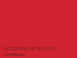 XYZ 26.876,14.732,4.116 Color is a normal red color and the nearest color is Amaranth Red #d3212d. Hex code #cf242f and RGB value is rgb(207,36,47). In RGB color space, this color is composed of 81% red, 14% green, 18% blue, In CMYK color space, this color is composed of 0% cyan, 83% magenta, 77% yellow , 19% black , In HSL color space, this color has a hue angle of 356° , 70% saturation and 48% lightness.