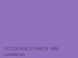 XYZ 26.876,21.548,51.458 Color is a normal violet color and the nearest color is Middle Blue Purple #8b72be. Hex code #9171be and RGB value is rgb(145,113,190). In RGB color space, this color is composed of 57% red, 44% green, 75% blue, In CMYK color space, this color is composed of 24% cyan, 41% magenta, 0% yellow , 25% black , In HSL color space, this color has a hue angle of 265° , 37% saturation and 59% lightness.