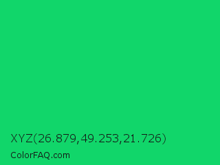 XYZ 26.879,49.253,21.726 Color is a normal green color and the nearest color is Malachite #0bda51. Hex code #11d66a and RGB value is rgb(17,214,106). In RGB color space, this color is composed of 7% red, 84% green, 42% blue, In CMYK color space, this color is composed of 92% cyan, 0% magenta, 50% yellow , 16% black , In HSL color space, this color has a hue angle of 147° , 85% saturation and 45% lightness.