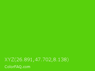 XYZ 26.891,47.702,8.138 Color is a normal green color and the nearest color is Harlequin Green #46cb18. Hex code #58d10c and RGB value is rgb(88,209,12). In RGB color space, this color is composed of 35% red, 82% green, 5% blue, In CMYK color space, this color is composed of 58% cyan, 0% magenta, 94% yellow , 18% black , In HSL color space, this color has a hue angle of 97° , 89% saturation and 43% lightness.