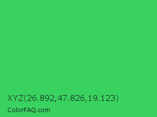 XYZ 26.892,47.826,19.123 Color is a normal green color and the nearest color is UFO Green #3cd070. Hex code #39d261 and RGB value is rgb(57,210,97). In RGB color space, this color is composed of 22% red, 82% green, 38% blue, In CMYK color space, this color is composed of 73% cyan, 0% magenta, 54% yellow , 18% black , In HSL color space, this color has a hue angle of 136° , 63% saturation and 52% lightness.