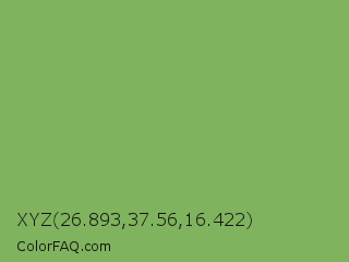 XYZ 26.893,37.56,16.422 Color is a normal green color and the nearest color is Bud Green #7bb661. Hex code #7fb35e and RGB value is rgb(127,179,94). In RGB color space, this color is composed of 50% red, 70% green, 37% blue, In CMYK color space, this color is composed of 29% cyan, 0% magenta, 47% yellow , 30% black , In HSL color space, this color has a hue angle of 97° , 36% saturation and 54% lightness.