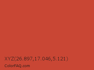 XYZ 26.897,17.046,5.121 Color is a normal red color and the nearest color is Mojo #c04737. Hex code #c94634 and RGB value is rgb(201,70,52). In RGB color space, this color is composed of 79% red, 27% green, 20% blue, In CMYK color space, this color is composed of 0% cyan, 65% magenta, 74% yellow , 21% black , In HSL color space, this color has a hue angle of 7° , 59% saturation and 50% lightness.