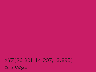 XYZ 26.901,14.207,13.895 Color is a normal rose color and the nearest color is Dogwood Rose #d71868. Hex code #c91c66 and RGB value is rgb(201,28,102). In RGB color space, this color is composed of 79% red, 11% green, 40% blue, In CMYK color space, this color is composed of 0% cyan, 86% magenta, 49% yellow , 21% black , In HSL color space, this color has a hue angle of 334° , 76% saturation and 45% lightness.