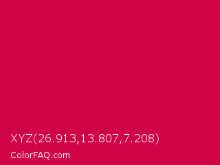 XYZ 26.913,13.807,7.208 Color is a normal rose color and the nearest color is Spanish Carmine #d10047. Hex code #cf0447 and RGB value is rgb(207,4,71). In RGB color space, this color is composed of 81% red, 2% green, 28% blue, In CMYK color space, this color is composed of 0% cyan, 98% magenta, 66% yellow , 19% black , In HSL color space, this color has a hue angle of 340° , 96% saturation and 41% lightness.