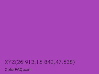 XYZ 26.913,15.842,47.538 Color is a normal purple color and the nearest color is Purple Plum #9c51b6. Hex code #a843b9 and RGB value is rgb(168,67,185). In RGB color space, this color is composed of 66% red, 26% green, 73% blue, In CMYK color space, this color is composed of 9% cyan, 64% magenta, 0% yellow , 27% black , In HSL color space, this color has a hue angle of 291° , 47% saturation and 49% lightness.