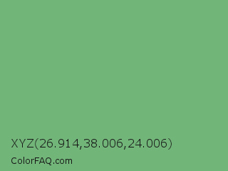 XYZ 26.914,38.006,24.006 Color is a normal green color and the nearest color is Iguana Green #71bc78. Hex code #72b579 and RGB value is rgb(114,181,121). In RGB color space, this color is composed of 45% red, 71% green, 47% blue, In CMYK color space, this color is composed of 37% cyan, 0% magenta, 33% yellow , 29% black , In HSL color space, this color has a hue angle of 126° , 31% saturation and 58% lightness.