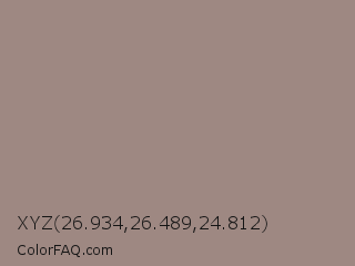 XYZ 26.934,26.489,24.812 Color is a normal red color and the nearest color is Cinereous #98817b. Hex code #9e8882 and RGB value is rgb(158,136,130). In RGB color space, this color is composed of 62% red, 53% green, 51% blue, In CMYK color space, this color is composed of 0% cyan, 14% magenta, 18% yellow , 38% black , In HSL color space, this color has a hue angle of 13° , 13% saturation and 56% lightness.