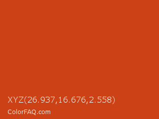 XYZ 26.937,16.676,2.558 Color is a normal red color and the nearest color is Sinopia #cb410b. Hex code #cc4116 and RGB value is rgb(204,65,22). In RGB color space, this color is composed of 80% red, 25% green, 9% blue, In CMYK color space, this color is composed of 0% cyan, 68% magenta, 89% yellow , 20% black , In HSL color space, this color has a hue angle of 14° , 81% saturation and 44% lightness.