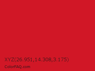 XYZ 26.951,14.308,3.175 Color is a normal red color and the nearest color is Lava #cf1020. Hex code #d11726 and RGB value is rgb(209,23,38). In RGB color space, this color is composed of 82% red, 9% green, 15% blue, In CMYK color space, this color is composed of 0% cyan, 89% magenta, 82% yellow , 18% black , In HSL color space, this color has a hue angle of 355° , 80% saturation and 45% lightness.