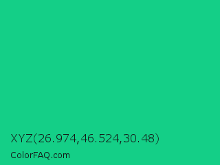 XYZ 26.974,46.524,30.48 Color is a normal green color and the nearest color is Caribbean Green #00cc99. Hex code #14cf87 and RGB value is rgb(20,207,135). In RGB color space, this color is composed of 8% red, 81% green, 53% blue, In CMYK color space, this color is composed of 90% cyan, 0% magenta, 35% yellow , 19% black , In HSL color space, this color has a hue angle of 157° , 82% saturation and 45% lightness.