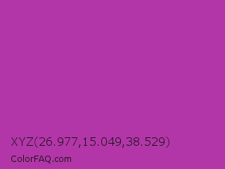 XYZ 26.977,15.049,38.529 Color is a normal magenta color and the nearest color is Byzantine #bd33a4. Hex code #b336a8 and RGB value is rgb(179,54,168). In RGB color space, this color is composed of 70% red, 21% green, 66% blue, In CMYK color space, this color is composed of 0% cyan, 70% magenta, 6% yellow , 30% black , In HSL color space, this color has a hue angle of 305° , 54% saturation and 46% lightness.