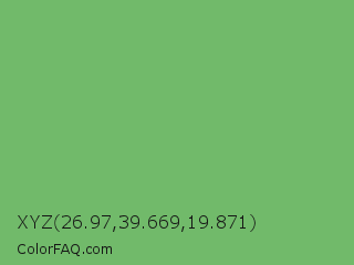 XYZ 26.97,39.669,19.871 Color is a normal green color and the nearest color is Mantis #74c365. Hex code #71ba6a and RGB value is rgb(113,186,106). In RGB color space, this color is composed of 44% red, 73% green, 42% blue, In CMYK color space, this color is composed of 39% cyan, 0% magenta, 43% yellow , 27% black , In HSL color space, this color has a hue angle of 115° , 37% saturation and 57% lightness.