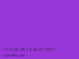 XYZ 26.98,14.42,67.007 Color is a normal purple color and the nearest color is Dark Orchid #9932cc. Hex code #9936d9 and RGB value is rgb(153,54,217). In RGB color space, this color is composed of 60% red, 21% green, 85% blue, In CMYK color space, this color is composed of 29% cyan, 75% magenta, 0% yellow , 15% black , In HSL color space, this color has a hue angle of 276° , 68% saturation and 53% lightness.