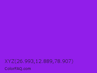 XYZ 26.993,12.889,78.907 Color is a normal purple color and the nearest color is Veronica #a020f0. Hex code #911eea and RGB value is rgb(145,30,234). In RGB color space, this color is composed of 57% red, 12% green, 92% blue, In CMYK color space, this color is composed of 38% cyan, 87% magenta, 0% yellow , 8% black , In HSL color space, this color has a hue angle of 274° , 83% saturation and 52% lightness.