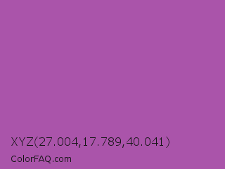 XYZ 27.004,17.789,40.041 Color is a normal magenta color and the nearest color is Purpureus #9a4eae. Hex code #aa54aa and RGB value is rgb(170,84,170). In RGB color space, this color is composed of 67% red, 33% green, 67% blue, In CMYK color space, this color is composed of 0% cyan, 51% magenta, 0% yellow , 33% black , In HSL color space, this color has a hue angle of 300° , 34% saturation and 50% lightness.
